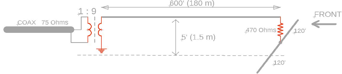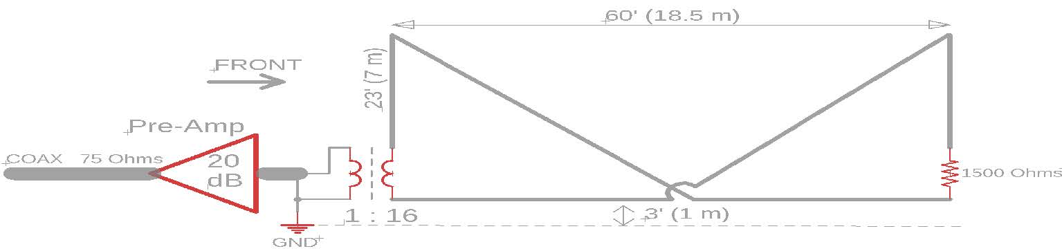 Es gibt einige wichtige Aspekte bei der Flag (und anderen Schleifen): Erstens sind die Abmessungen nicht kritisch, ebenso wenig das genaue Übersetzungsverhältnis des Übertragers oder der Wert des Abschlusswiderstands. Ein 1:9-Übertrager funktioniert ebenfalls, und der Abschlusswiderstand kann irgendwo zwischen 900 und 1.200 Ohm liegen, solange Sie keine extrem scharfe Null nach hinten brauchen. Die hier angegebenen Werte sind diejenigen, die ich verwende und durchgerechnet habe. Man kann die Antenne um drei Meter kürzen, ohne dass sich viel ändert. Machen Sie sie aber nicht zu klein, sonst funktioniert sie nicht mehr! Die Signalspannung der Schleife ist proportional zur umschlossenen Fläche. Wird die Antenne zu klein (Gewinn -50 dBi oder schlechter), ist das empfangene Signal so niedrig, dass es nahe am thermischen Rauschen des Abschlusswiderstands liegt. S9-Signale hört man noch, aber schwächere Signale werden vom Widerstandsrauschen überdeckt. Ein Vorverstärker kann das nicht mehr „reparieren“.