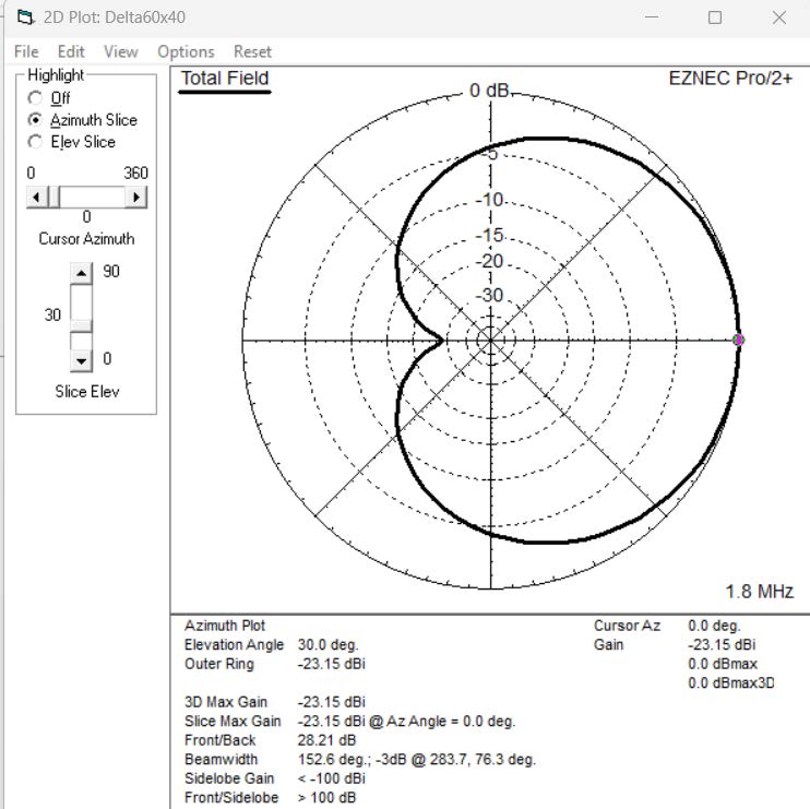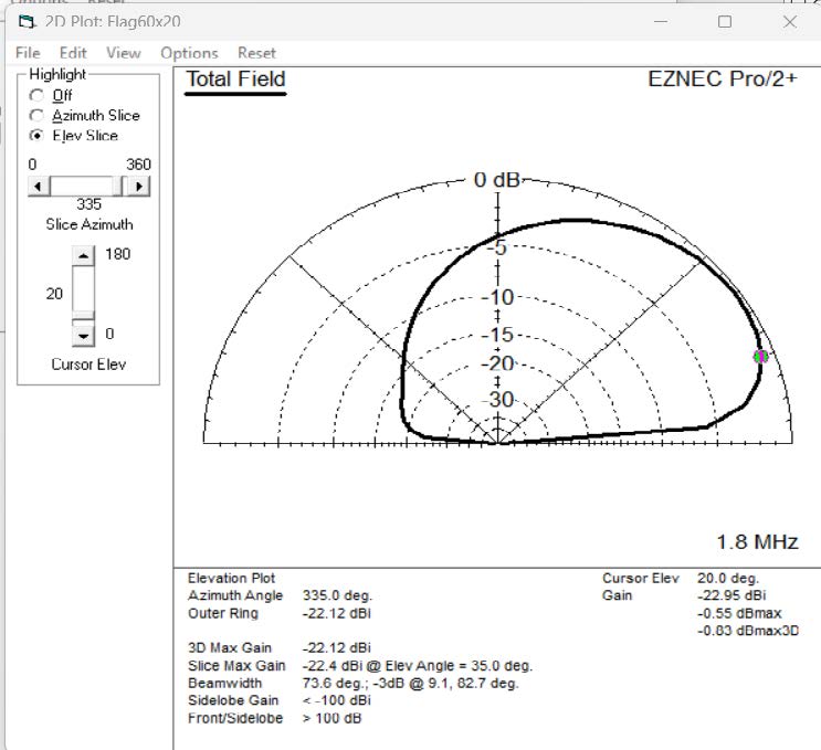 Die oben gezeigte Flag hat aufgrund ihrer Größe einen Gewinn von -22 dBi. Eine kleinere Version hätte geringeren Gewinn, dafür leicht bessere Vor-/Rückdämpfung und einen etwas höheren DF. Außerdem ist die ursprüngliche Größe auf 80 m weniger nützlich. Wenn Sie die 160-m-Performance maximieren wollen, ist diese größere Antenne mit höherem Ausgangssignal besser. Ist Ihnen 80 m sehr wichtig, könnte eine 40×14-Fuß-Variante sinnvoller sein.