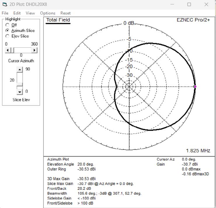 Ein DF (Richtfaktor) von 9,3 dB ist hervorragend. Wo ist der Haken? Der Haken ist der deutlich geringere Gewinn: -31 dBi vs. -23 dBi – also etwa 10 dB niedrigere Signal- (und Rausch-)pegel als bei der Delta-Loop. Viele Funkamateure, die eine DHDL ausprobiert haben, waren enttäuscht und dachten: „Die Antenne ist taub.“ So klingt sie auch: Ein Signal, das an der TX-Antenne bei -120 dBm liegt, kommt an der DHDL bei -145 dBm heraus. Das ist eine sehr kleine Signalspannung; ein rauscharmer Vorverstärker mit 20 dB Gain direkt an der Antenne ist zwingend notwendig.