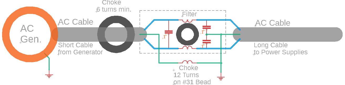 Neben dem Inverter-Generator sind Schaltnetzteile die Hauptquellen von Rauschen. Deren Störungen werden durch andere Geräte mit Mikroprozessoren noch verstärkt. Rauschen, das auf der Außenseite des Koaxmantels der Hauptantenne als Gleichtaktstrom geführt wird, kann in die Antenne einkoppeln; diese strahlt es dann ab. Die RX-Antenne in der Nähe kann dieses re-strahlte Rauschen wiederum aufnehmen. Ein in die Generatorausgänge eingefügtes Filter sowie Drosseln auf Netz-, Steuer- und Koaxleitungen, kombiniert mit sorgfältiger Erdung, reduzieren die in den Empfänger gelangenden Störungen erheblich.