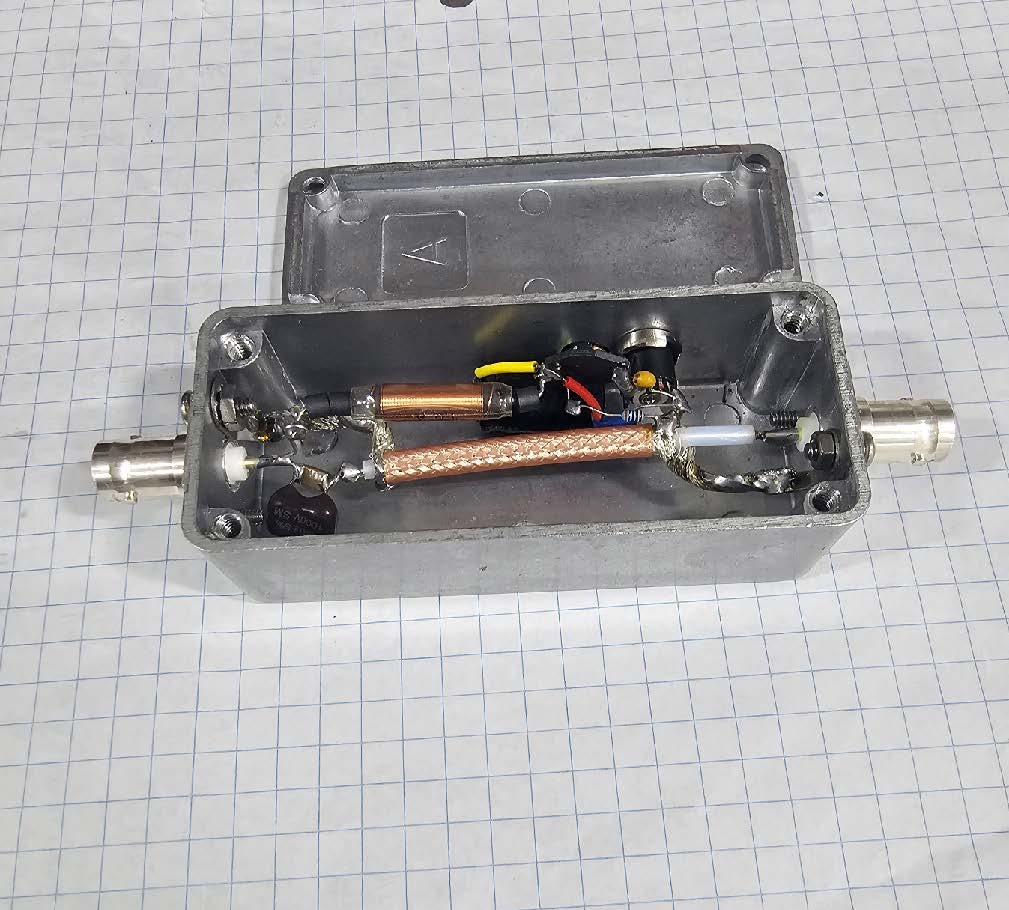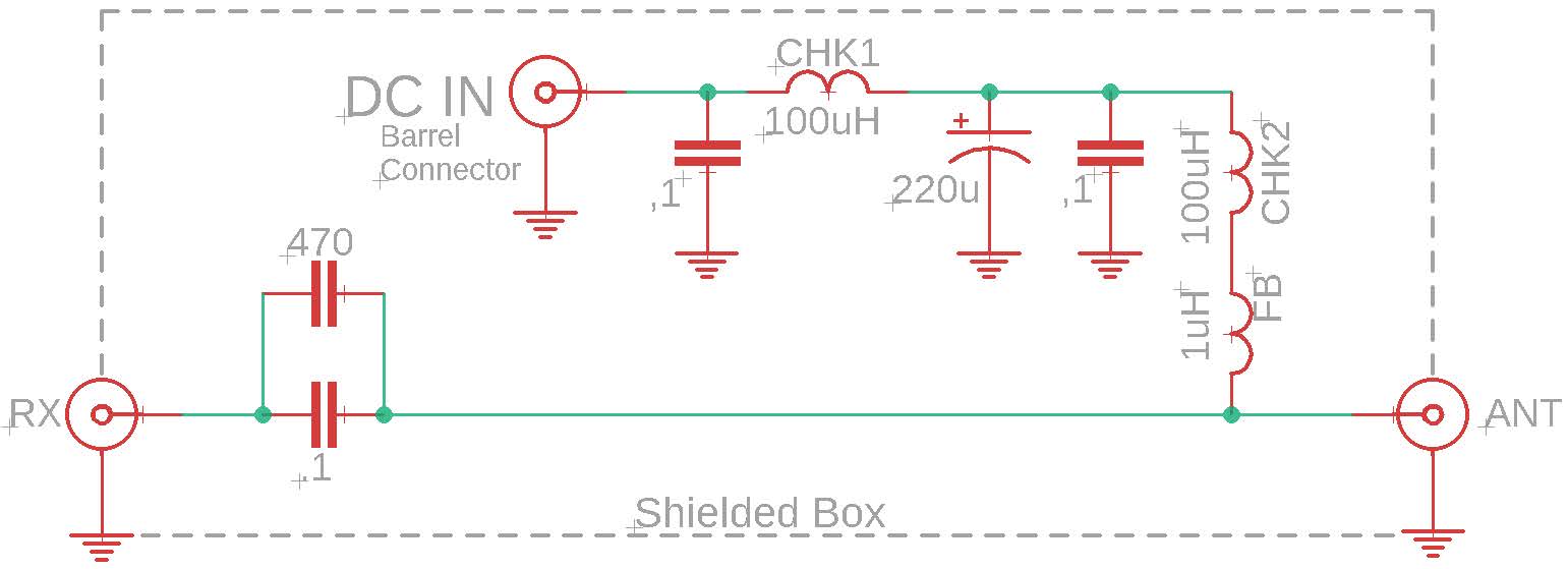 Zur Versorgung des Vorverstärkers (und eventuell benötigter Relais) kann die Koax-Mitte mit +12 V (oder einer anderen DC-Spannung) belegt werden. An beiden Enden wird ein DC-Einspeiseglied (Bias-T) verwendet. Es ist extrem wichtig, sicherzustellen, dass die DC-Spannung gut gefiltert ist, bevor sie ins Koax eingespeist wird. Schaltnetzteile sind wegen ihres geringen Gewichts und Volumens zwar attraktiv, können aber erhebliche Störanteile auf ihrer Ausgangsspannung haben. Man muss verhindern, dass diese oder andere Störungen ins Koax gelangen. Als erster offensichtlicher Schritt sollten alle Netzteil-Ausgänge gut abgeblockt und gefiltert werden (Drossel plus Kondensator). Das Schaltbild und die Bilder unten zeigen die DC-Einspeisung, die ich verwende. Beachten Sie die zusätzliche Filterung der DC-Spannung (CHOKE1 und 220-µF-Kondensator).
