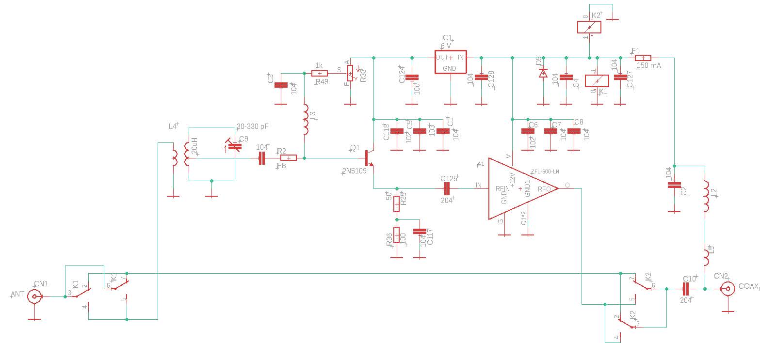 Wenn Sie keinen eigenen Vorverstärker bauen möchten, eignet sich der DX Engineering SV-BF-994x5 (https://www.dxengineering.com/parts/svp-sv-bf-994x5#overview) sehr gut. Sie müssen lediglich die Stromauskopplung (siehe DC-Einspeiseschaltung unten) bauen und in ein wasserdichtes Gehäuse setzen. Drehen Sie die Verstärkung nicht zu hoch! Der Verstärker kann bis zu 40 dB liefern, wird bei dieser Verstärkung aber leicht übersteuert und erzeugt IM-Produkte. Halten Sie die Verstärkung bei 20 dB; dort besitzt er einen vernünftigen IP3 und seine beste Rauschzahl.
