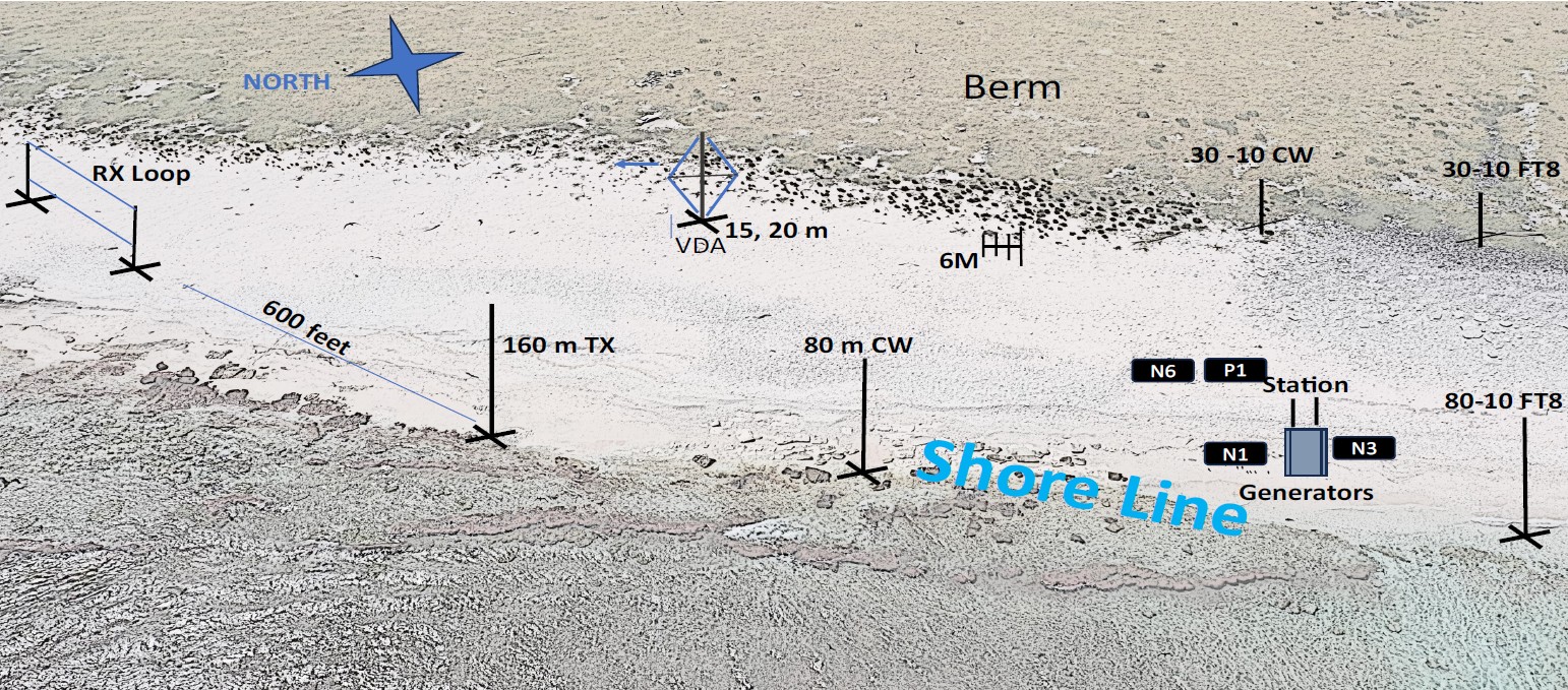 Die folgende Abbildung zeigt das Stations- und Antennenlayout der N5J-DXpedition. Die Lowband-Antennen liegen entlang der Küstenlinie, wo sie vom guten Erdpotential des Salzwassers profitieren. Die Station und die Generatoren sind ebenfalls nahe am Wasser. Die RX-Antenne ist am weitesten entfernt, etwa 600 Fuß von der 160-m-TX-Antenne.