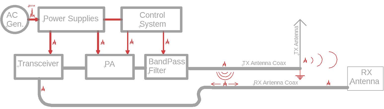 Neben dem Inverter-Generator sind Schaltnetzteile die Hauptquellen von Rauschen. Deren Störungen werden durch andere Geräte mit Mikroprozessoren noch verstärkt. Rauschen, das auf der Außenseite des Koaxmantels der Hauptantenne als Gleichtaktstrom geführt wird, kann in die Antenne einkoppeln; diese strahlt es dann ab. Die RX-Antenne in der Nähe kann dieses re-strahlte Rauschen wiederum aufnehmen. Ein in die Generatorausgänge eingefügtes Filter sowie Drosseln auf Netz-, Steuer- und Koaxleitungen, kombiniert mit sorgfältiger Erdung, reduzieren die in den Empfänger gelangenden Störungen erheblich.